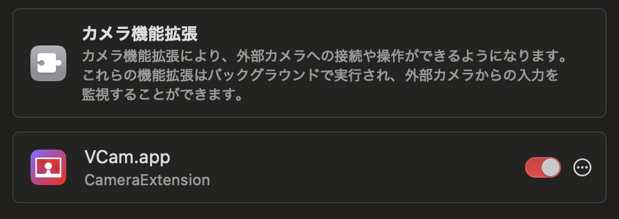 インストールやアンインストール後は Mac の設定の「一般」→「ログイン項目と拡張機能」→「カメラ機能拡張」の i マーク →VCam.app の CameraExtension を有効にする必要があります。